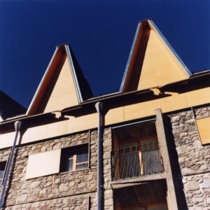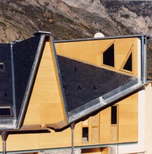 En este proyecto el objetivo era  hacer , con la normativa urbanística estricta por el uso de materiales (piedra natural y madera), un edifico moderno que encaje en su entorno. Lo logramos distinguirlo por  los tejados inclinados que se refieren a las altas montañas y dan una propia identidad al edificio.